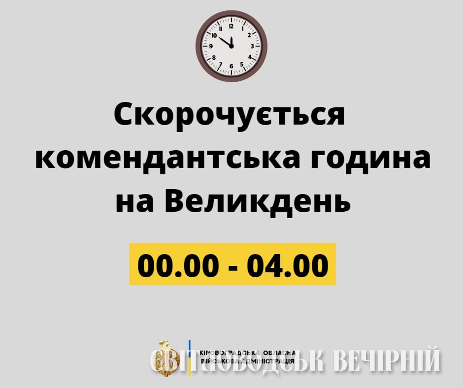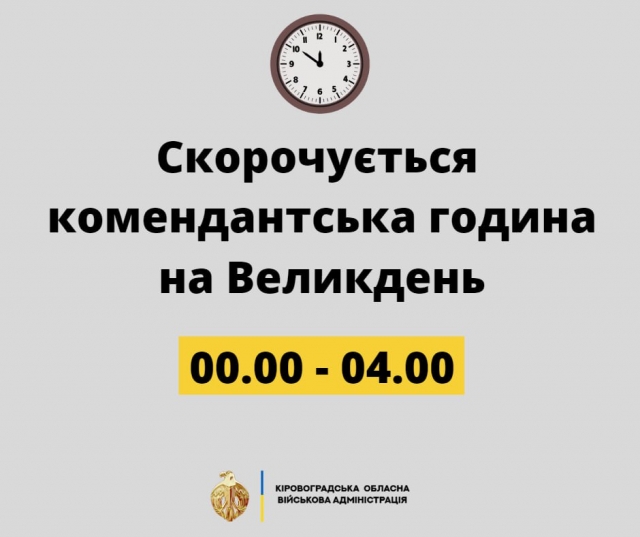 «Друзі, ми врахували побажання вірян і змінили час комендантської години. У Великодні дні, 15-го та 16-го квітня, вона триватиме з опівночі до четвертої години ранку», - повідомив у своєму телеграм каналі начальник Кіровоградської обласної військової адміністрації Андрій Райкович.
