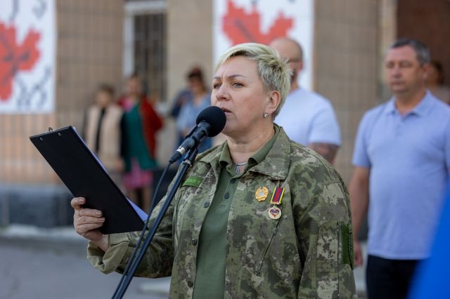 Марина Салабутіна закликала вшанувати пам’ять воїна покладанням квітів та хвилиною мовчання.