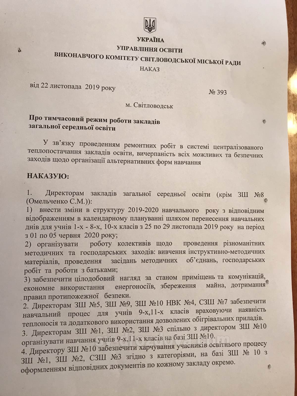 навчання для учнів 9-х та 11-х класів організовуються з 25 листопада у школах № 5, 9, 10, 4, 7, де є теплопостачання;