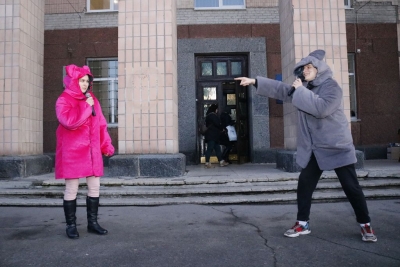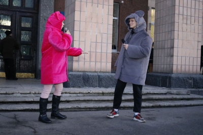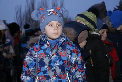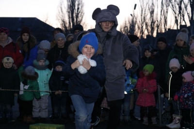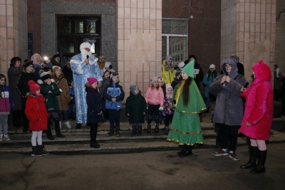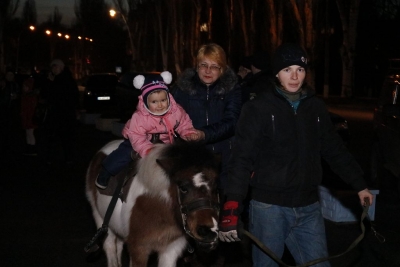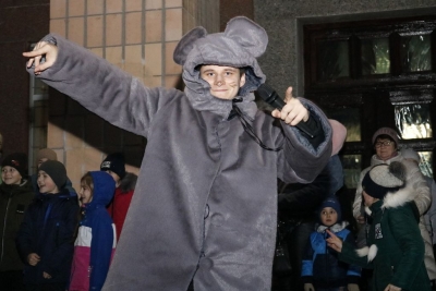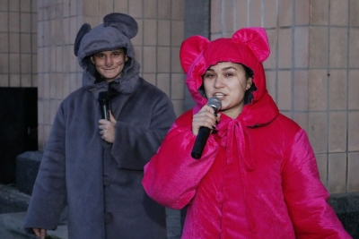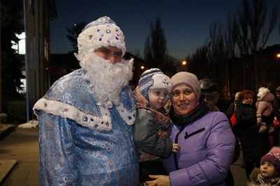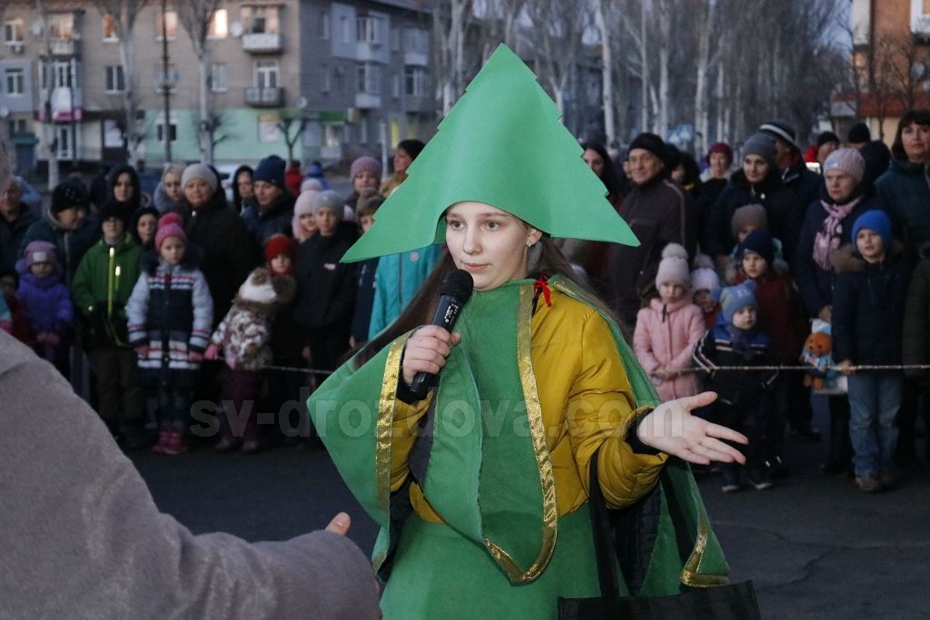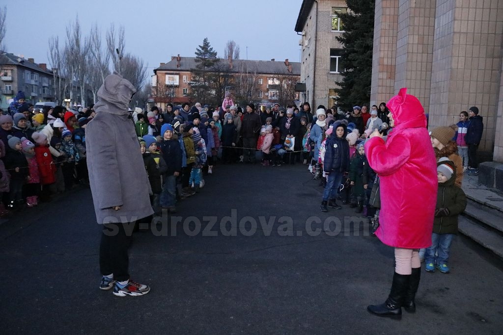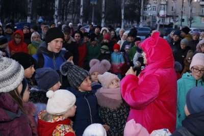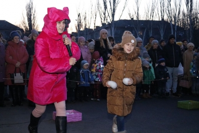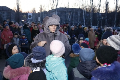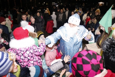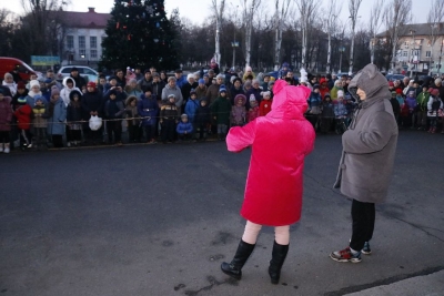 Всього чотири героя було на імпровізованій сцені, які розважали дітей: свинка Пепа (Марія Сущенко, художній керівник Палацу культури), Щур Ремі (Максим Василенко, головний режисер), Ялинка (Настя Кірєєва, учениця 8 класу школи № 10) та Святий Миколай (Костянтин Малько, актор театру «Амбіція»). Але їм вдалося створити святкову атмосферу і залучити десятки дітей до активної участі в іграх, танцях, хороводах.