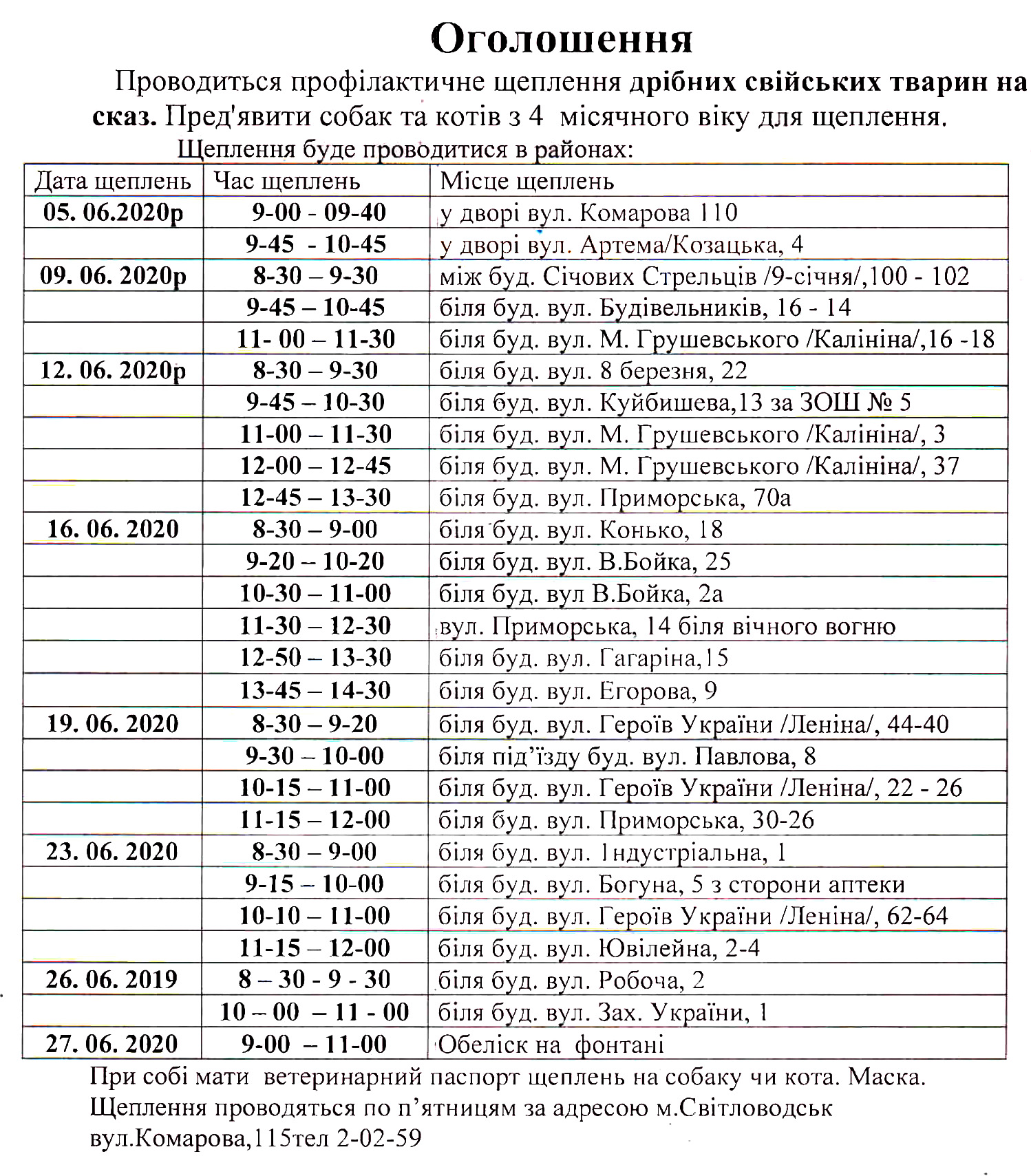 У червні 2020 року фахівці міської лікарні ветеринарної медицини проводитимуть щеплення тварин у комунальному секторі міста за графіком. Щеплення тварин проти сказу на території смт Власівка проводиться постійно.