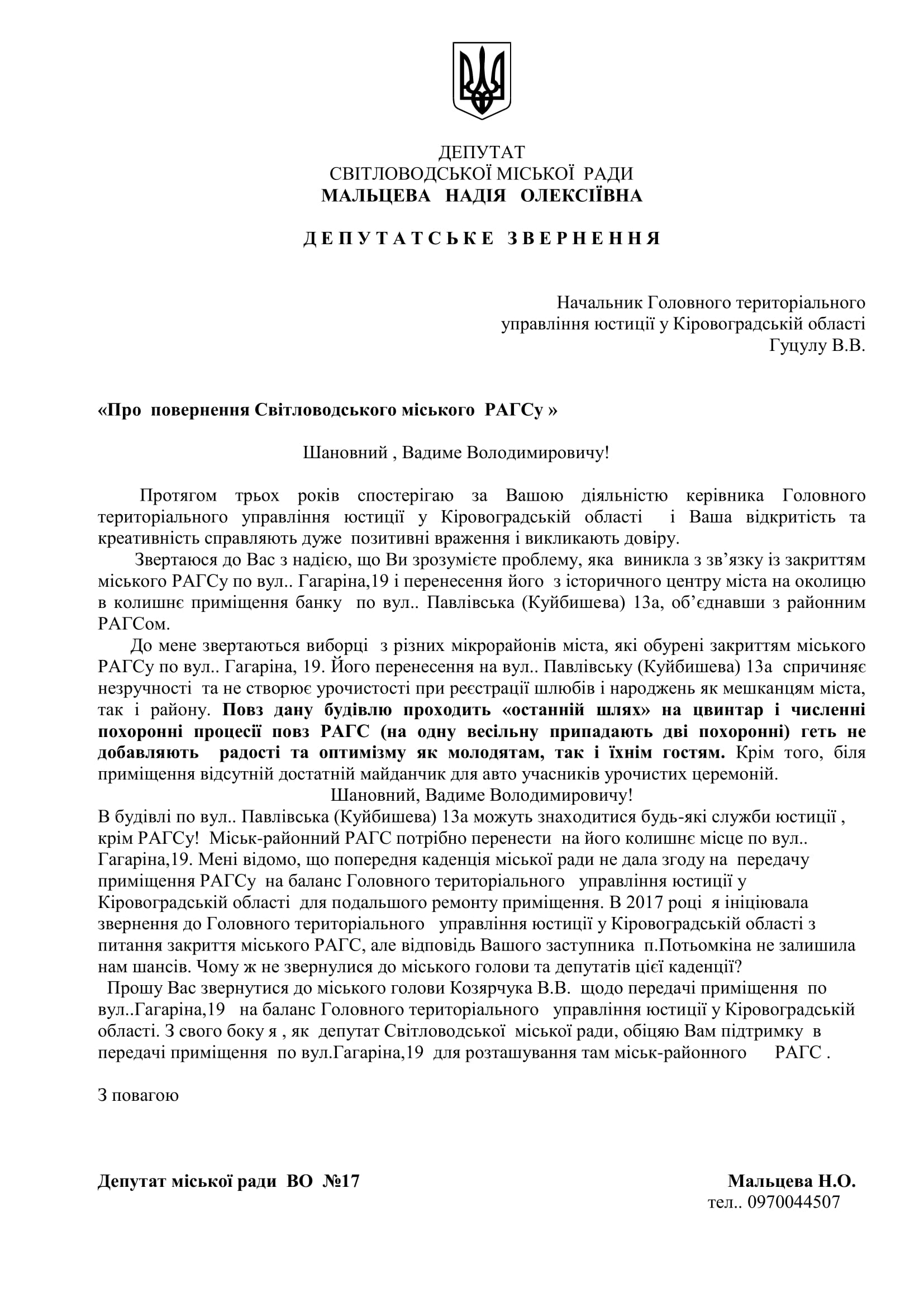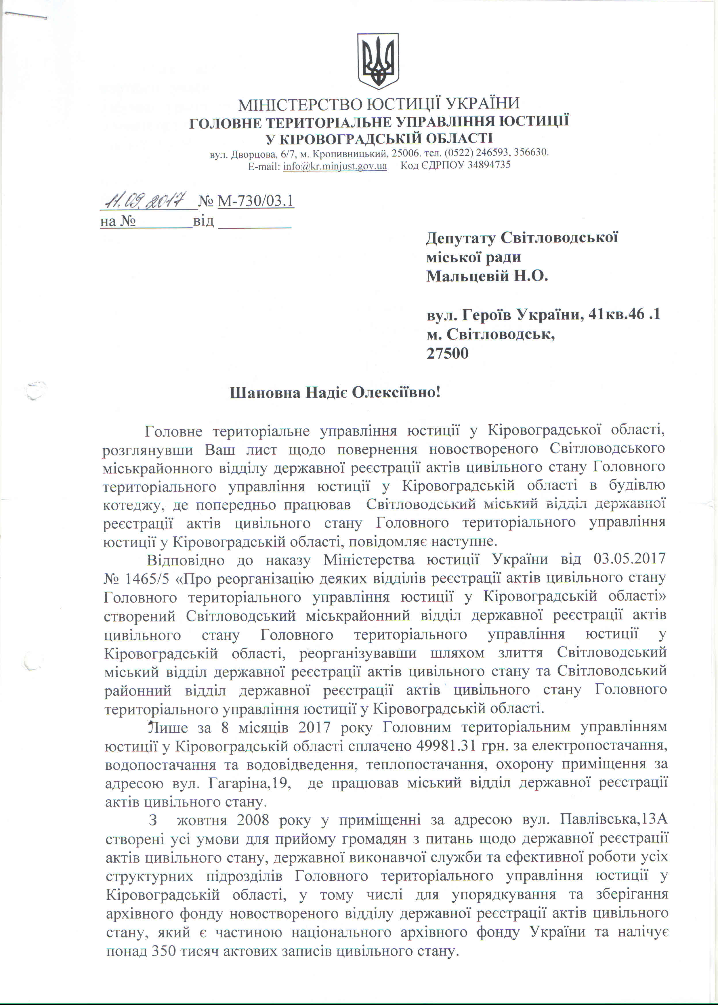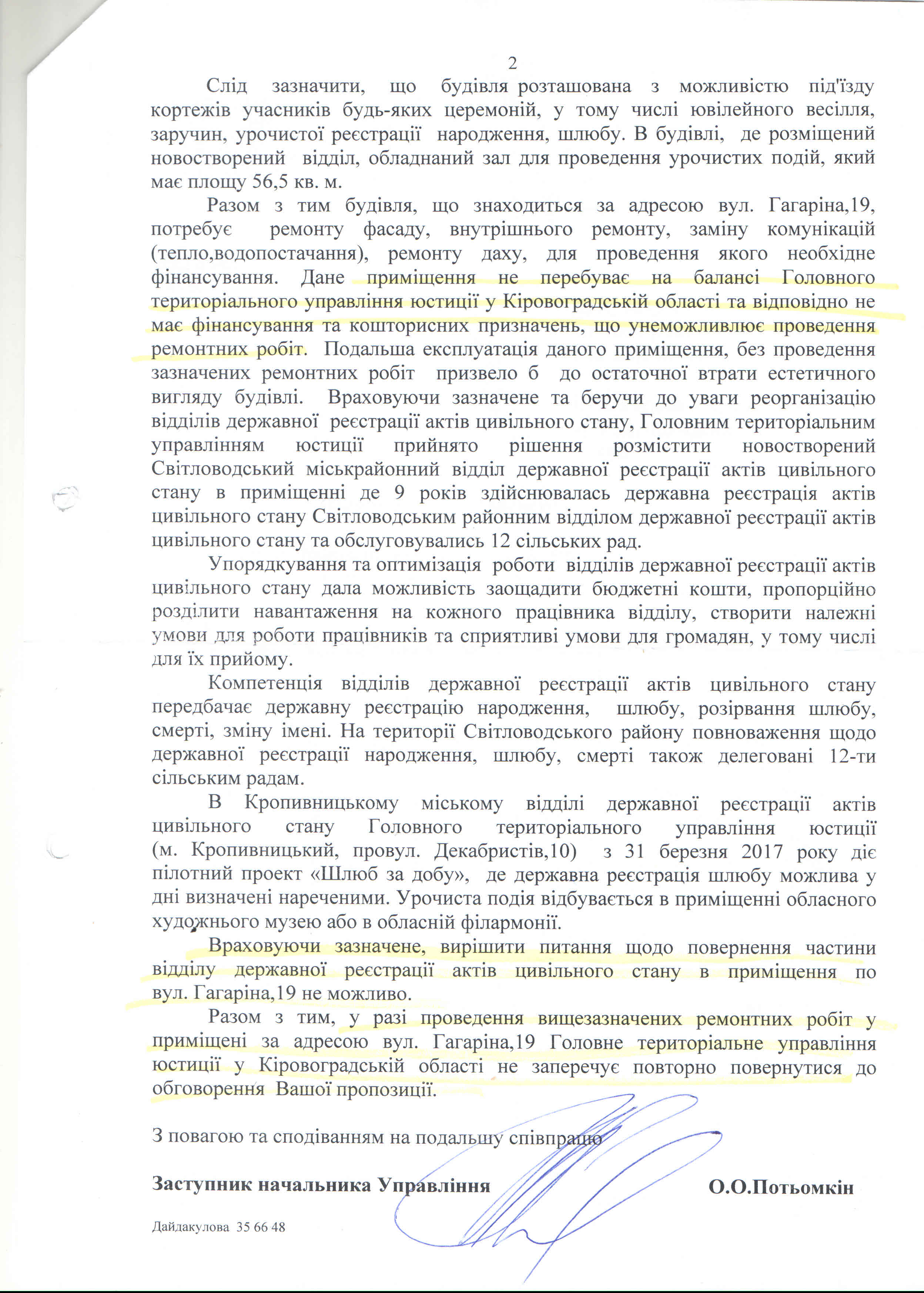 Заради справедливості хочу зазначити, що попередня каденція міської ради не дала згоду на передачу приміщення відділу ДРАЦС на баланс Головного територіального управління юстиції у Кіровоградській області для подальшого капітального ремонту приміщення, на відміну від дитячого садочка, який було передано під суд.