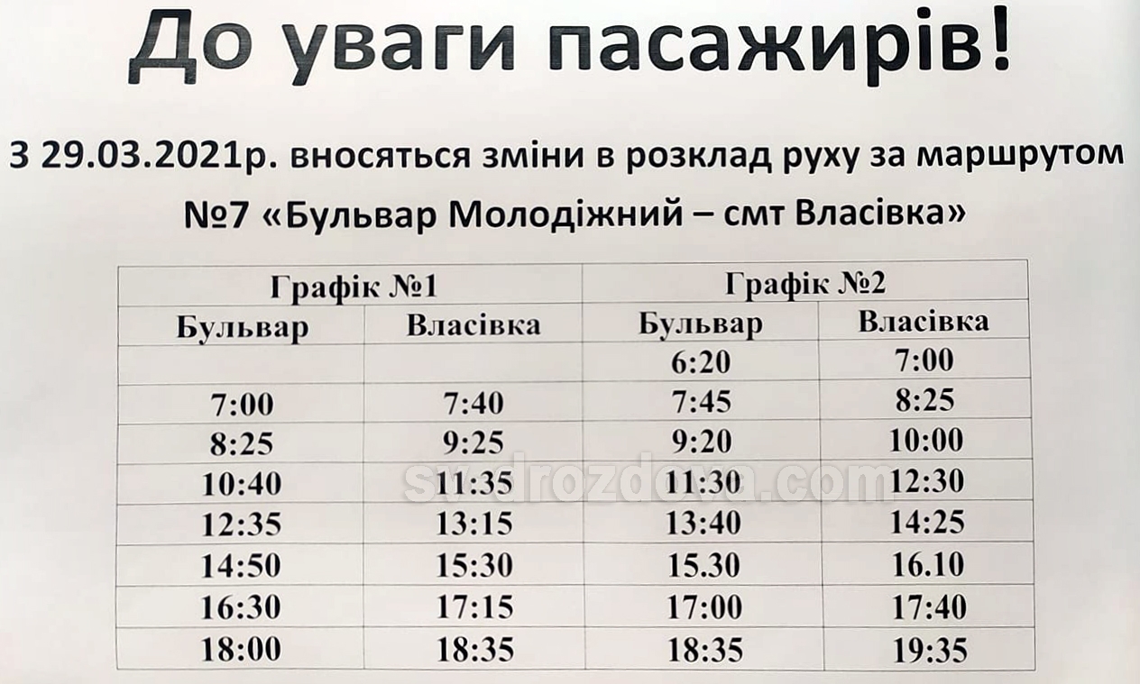 Оголошення / top 29-03-2021, 17:10 bur 6 750 Версія для друку Графік руху автобусів за маршрутом «Бульвар Молодіжний - Власівка» змінено! Змінено відсьогодні, тобто з 29 березня. Про це повідомляє Ірина Яшна, начальник автоколони ПРАТ «Світловодське АТП 13507».Дивіться новий графік! «СВ»