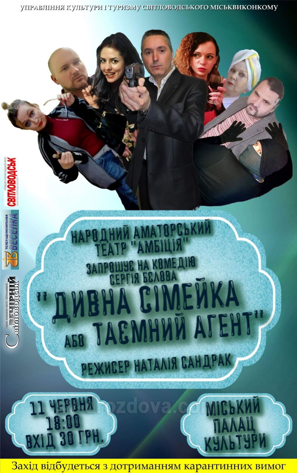 Народний аматорський театр "Амбіція" запрошує на інтригуючу та захоплюючу виставу "Дивна сімейка або таємний агент", яка відбудеться 11 червня о 18:00 у міському Палаці культури. Режисер - Наталія Сандрак.