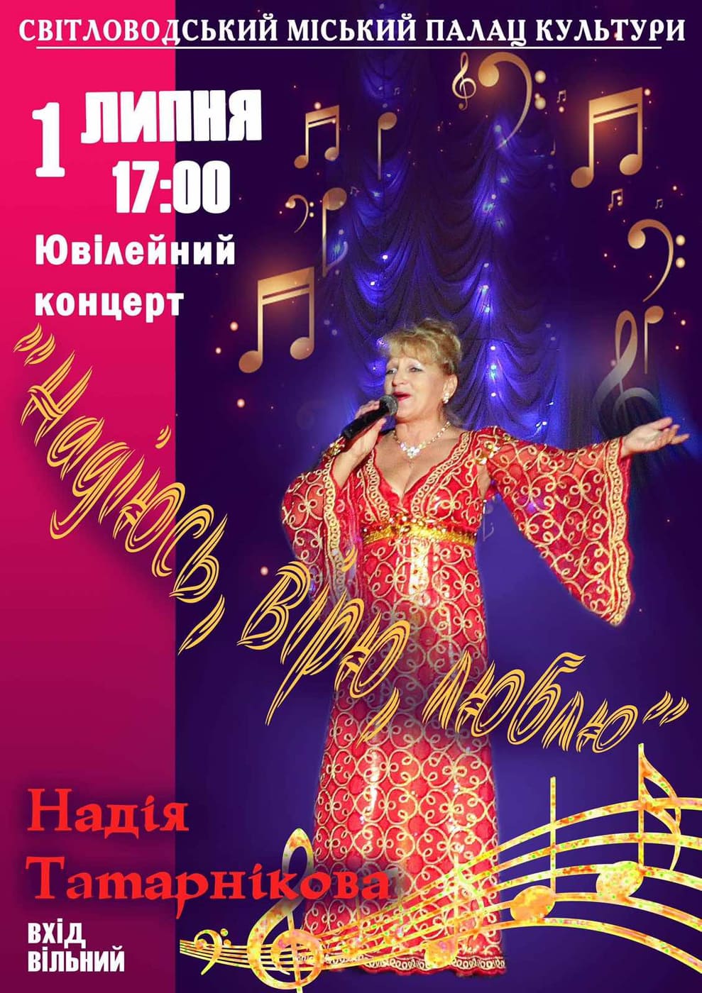 Культура / top 25-06-2021, 13:52 bur 1 131 Версія для друку Надія Татарнікова запрошує на ювілейний концерт Любов глядачів надихає цю знану на теренах Світловодщини і далеко за її межами співачку на нові концерти, а ще вона її дуже омолоджує. Ніколи не здогадаєтесь про який саме ювілей йдеться… Приходьте на концерт!