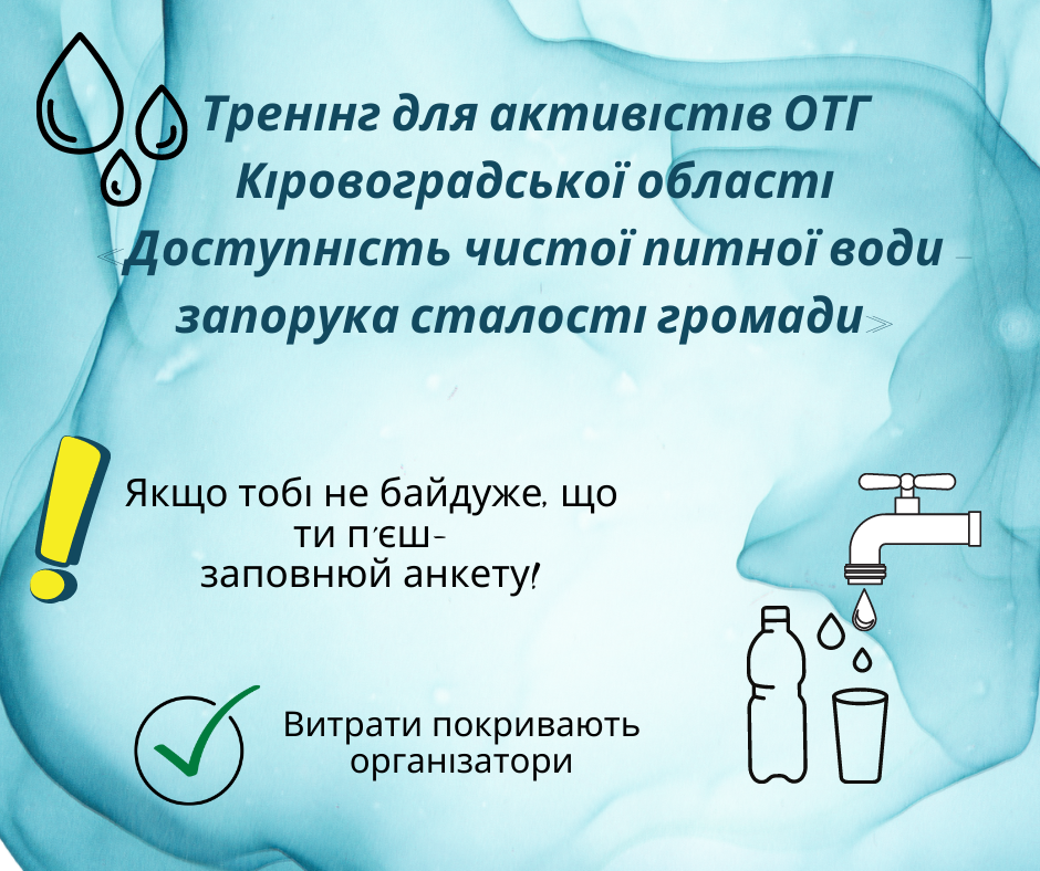 Громадська організація «Флора» запрошує активістів ОТГ Кіровоградської області, які цікавляться питаннями доступності чистої питної води та ефективних каналізаційних послуг для мешканців ОТГ області. За результатами навчання, для деяких учасників, передбачена можливість подальшої співпраці у цій сфері, з можливістю отримання фінансової винагороди.