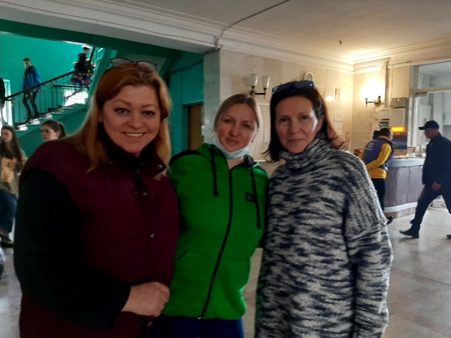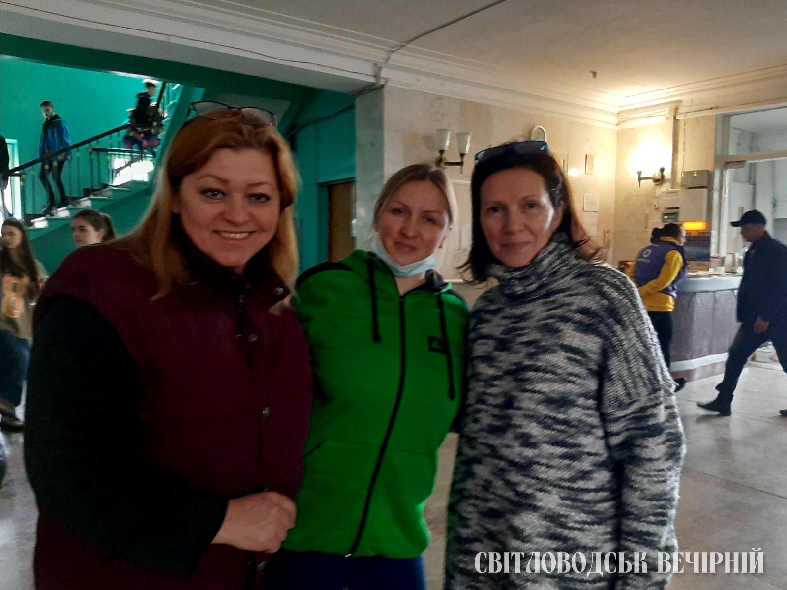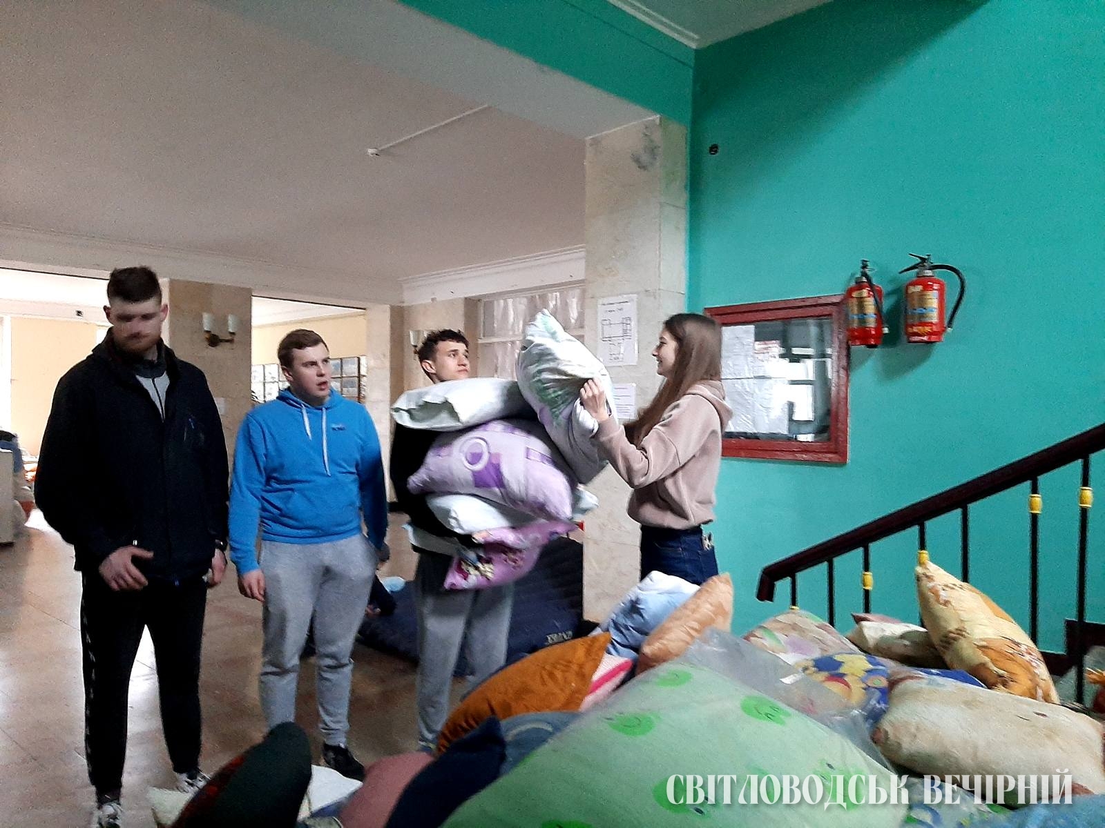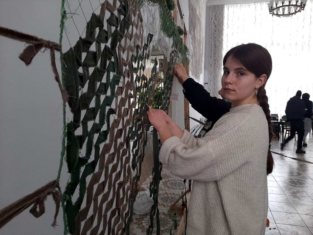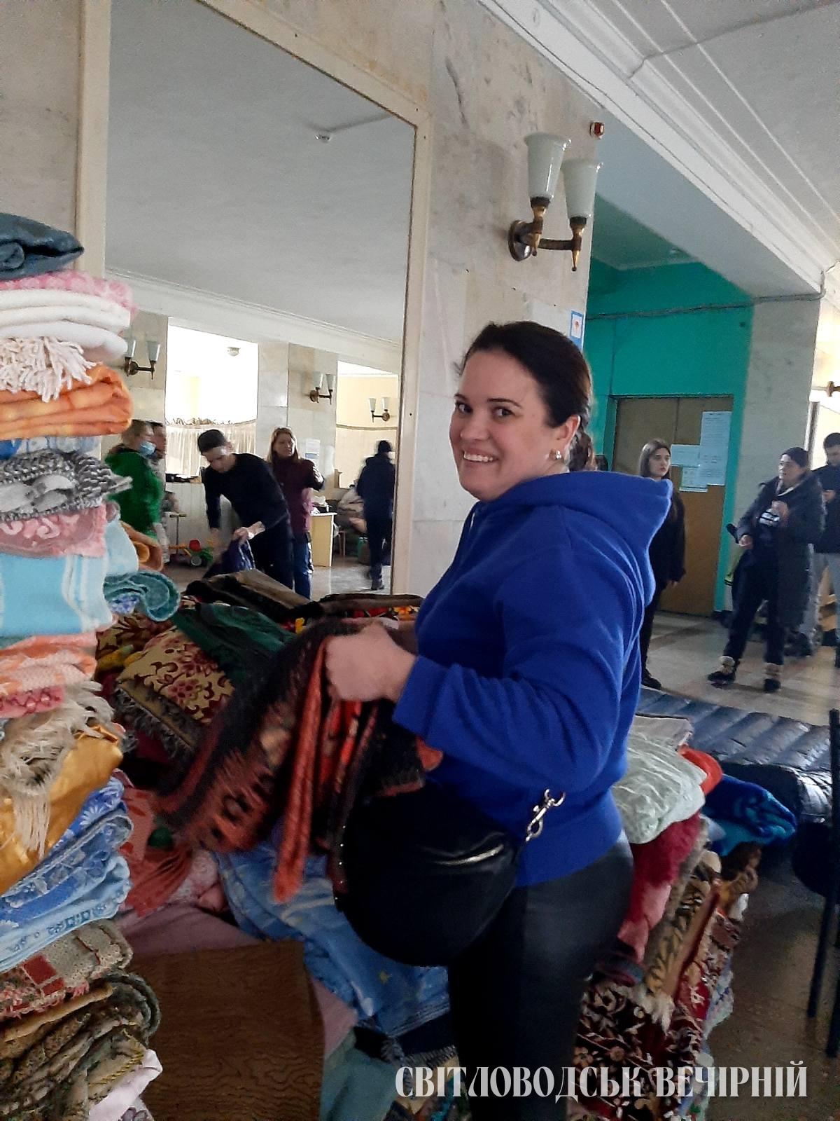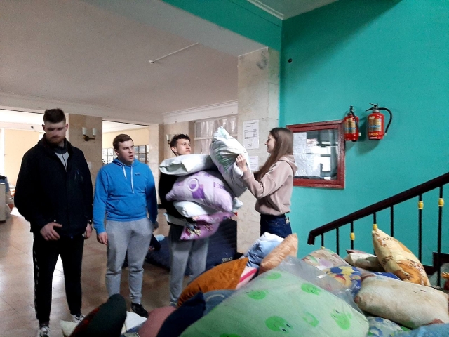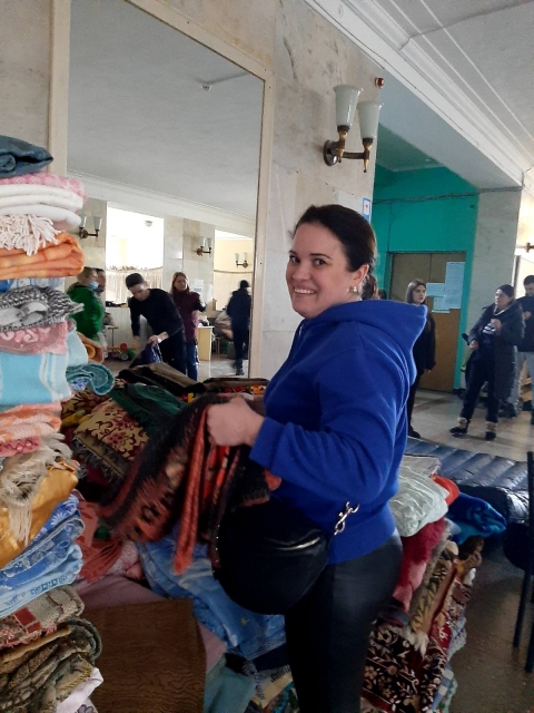 Люди різних поколінь, дуже багато молоді, задіяні на різних роботах, спрямованих на допомогу евакуйованим та нашій армії.Тут теж плетуть сітки для ЗСУ, приймають ковдри, подушки, матраци, білизну для біженців. Жителі міста несуть сюди продукти харчування, ліки.