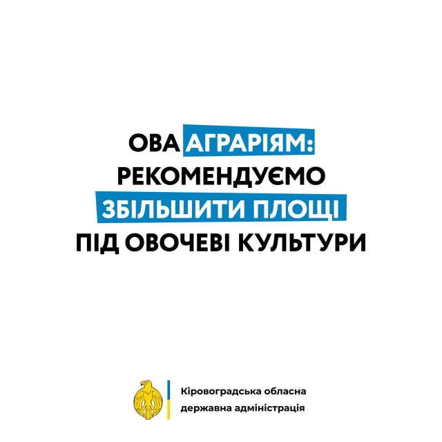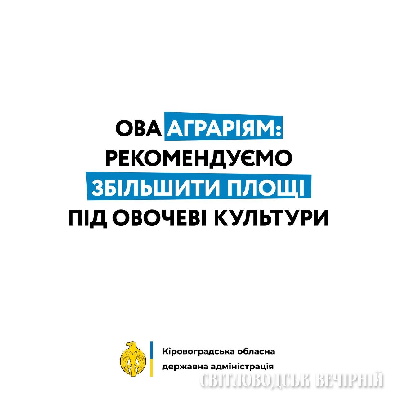 Кіровоградська ОВА рекомендує аграріям збільшити площі земель, які виділять під висадку овочевих культур. Як повідомили в департаменті АПК, така необхідність виникла в першу чергу для забезпечення соціальних закладів, шкіл, дитячих садочків та лікарень. Тож районним військовим адміністраціям, міським, селищним та сільським радам рекомендовано суттєво збільшити посів овочевих культур в сільськогосподарських підприємствах на території громади.